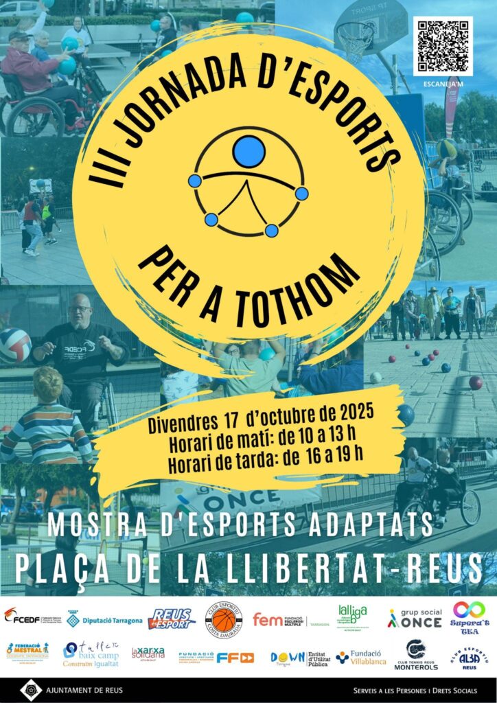 Torna la mostra d’esports adaptats a Reus, la jornada tindrà lloc a la Plaça Llibertat el pròxim 17 d’octubre 2025. Comptarà amb dos horaris: matí (sessions escolars) de 10 a 13 h i tarda (oberta a tothom) de 16 a 19 h.